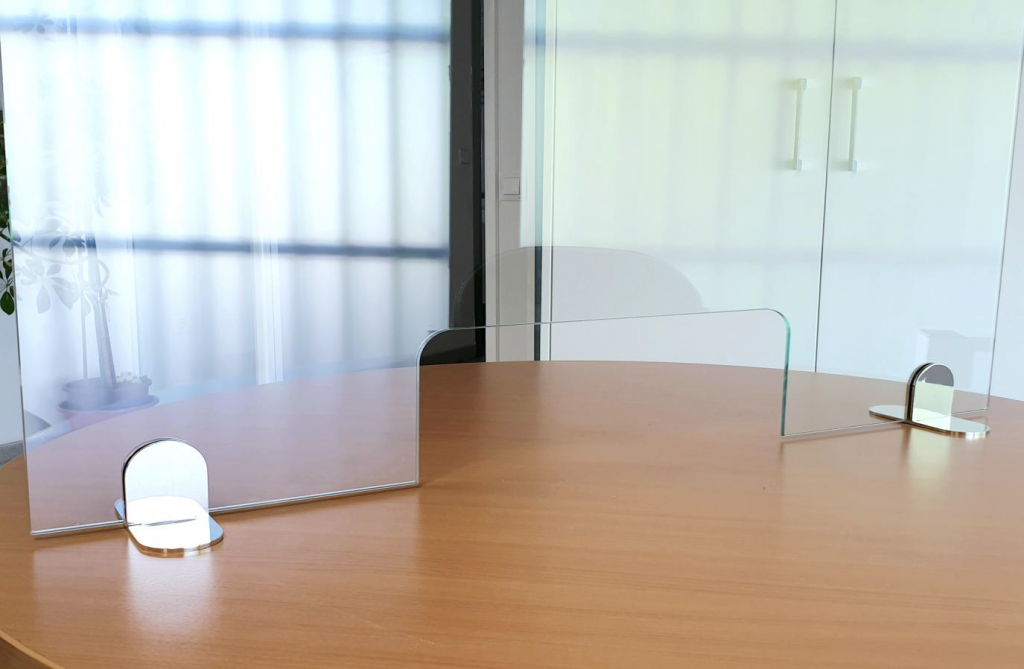 Separadores de cristal laminar 3+3 con pata metálica de 4mm de espesor y 150mm de longitud, que le otorga gran estabilidad, cortada a laser y cromada. En su parte inferior, el pie puede llevar una lámina antideslizante ó cinta adhesiva doble cara para dejar el separador fijo. Posibilidad de hacer los separadores a medida según necesidad del cliente
